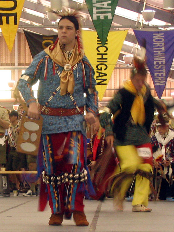 The Tennis Center on the Indiana University campus hosted the individual competitions. Inside, two large dance rings filled half the floor. Spectators sat around the ring and in the gallery above, enjoying the dancing and singing. The air was filled with sound: hundreds of bells from the dancers' costumes jingled with movement and two singing drum groups, Strongheart Singers and Mackenzie River, provided dance music. These singing groups travel to various pow wows and dances across the country; most were Scouts when they were younger, if they aren't still directly involved.