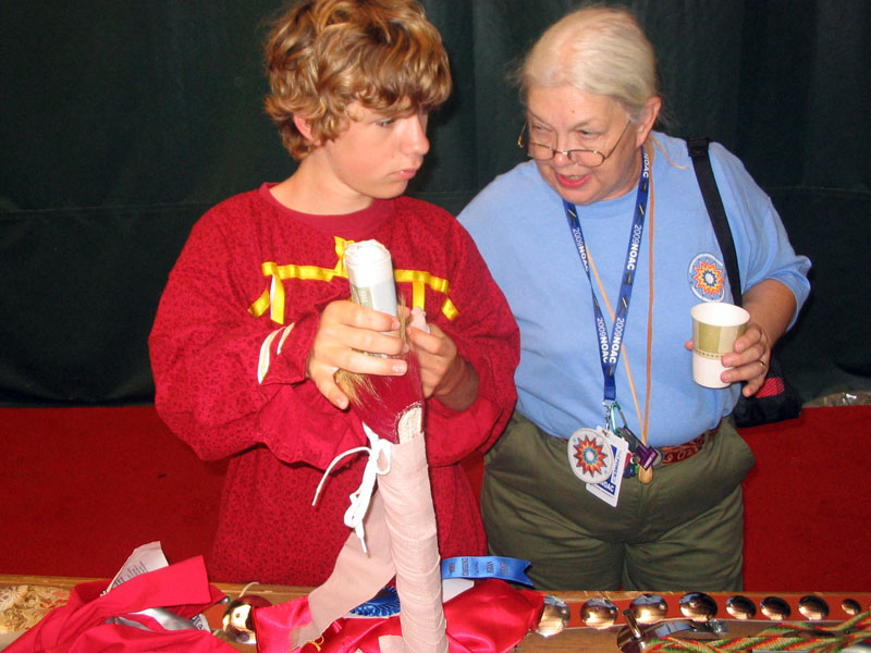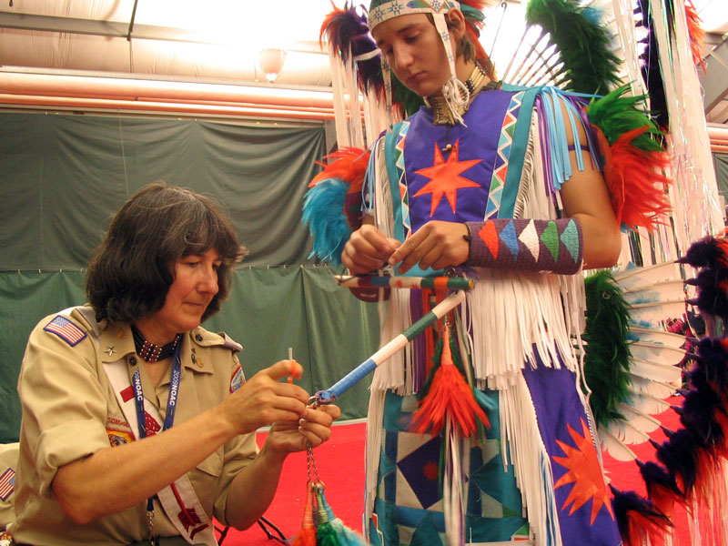 Alex J, a fancy dancer from Owaneco Lodge and the Connecticut Yankee Council, took a few moments before the fancy dance heats began to reinforce parts of his whip stick. He had help from advisers in his lodge who brought spare parts, thread, glue, tape and assorted other supplies to fix just about any costume problem. For those dancers who did not come equipped with a full repair kit, the American Indian Affairs committee also had a Dancer's Emergency Repair Team, where skilled staff members have emergency supplies to fix parts of a costume that might be coming loose.