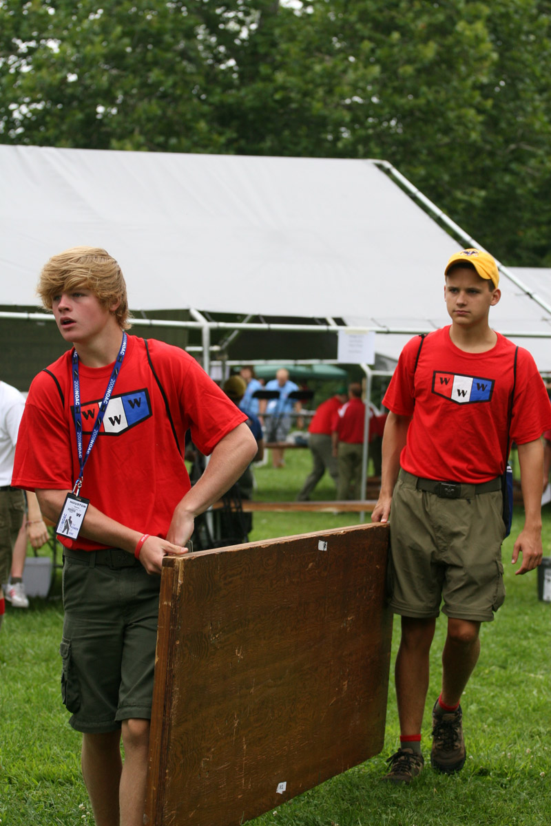 Early on Wednesday morning at NOAC, Lodges are busy working one setting up their Founders Day booths. Many, many Arrowman were walking with intent to try to finish set-up before lunchtime. After lunch, Founders Day starts.